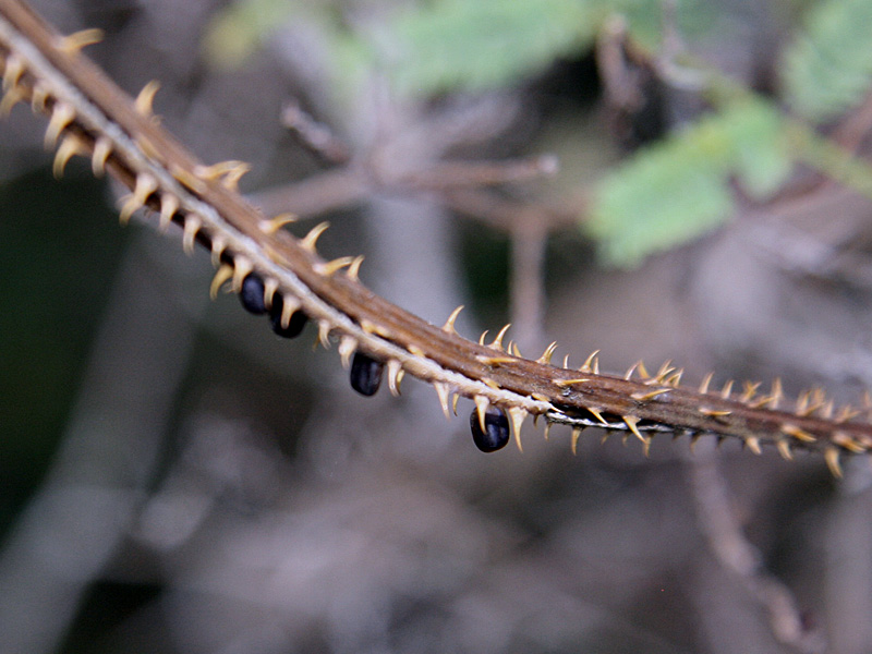 This armored seed pod splits into four segments, when ripe, giving rise to the common name four valve mimosa and the species name quadrivalvis.