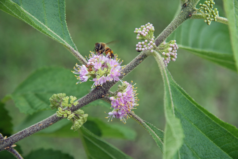 European honeybees nectar our native plants, including beautyberry (Callicarpa americana), now in flower at the Oslo Riverfront Conservation Area …