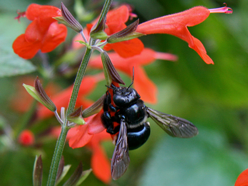 Pictured above is one of our solitary native bees, the southern carpenter bee (Xylocopa micas) nectaring upon tropical sage (Salvia coccinea), an easy-to-grow native wildflower that attracts butterflies, hummingbirds, and bees.