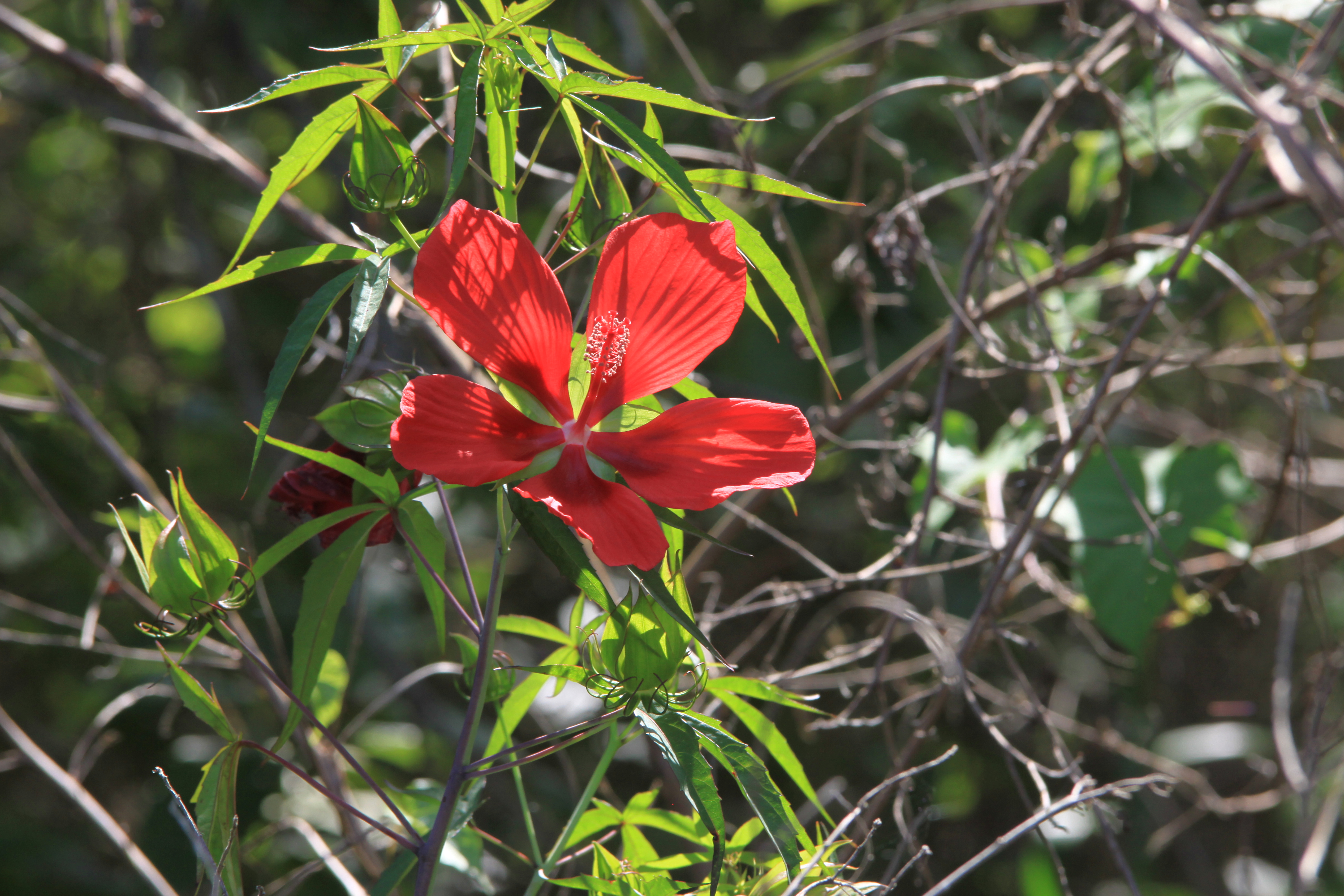 In the late fall or winter, swamp hibiscus dies back to the ground to re-memerge in the spring, quickly growing to be 6 to 8 feet tall. Its showy scarlet red flowers are at least six inches across.
