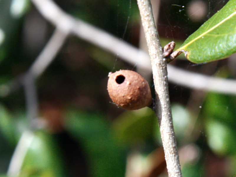 The myrtle oak forms the gall pictured above in response to chemicals produced by the gall wasp as it inserts its eggs into the plant tissues and by the larvae that develop inside the protective structure of the gall. Note the obvious exit hole left by the emerging adult!
