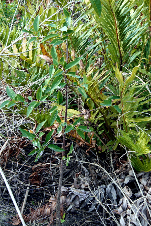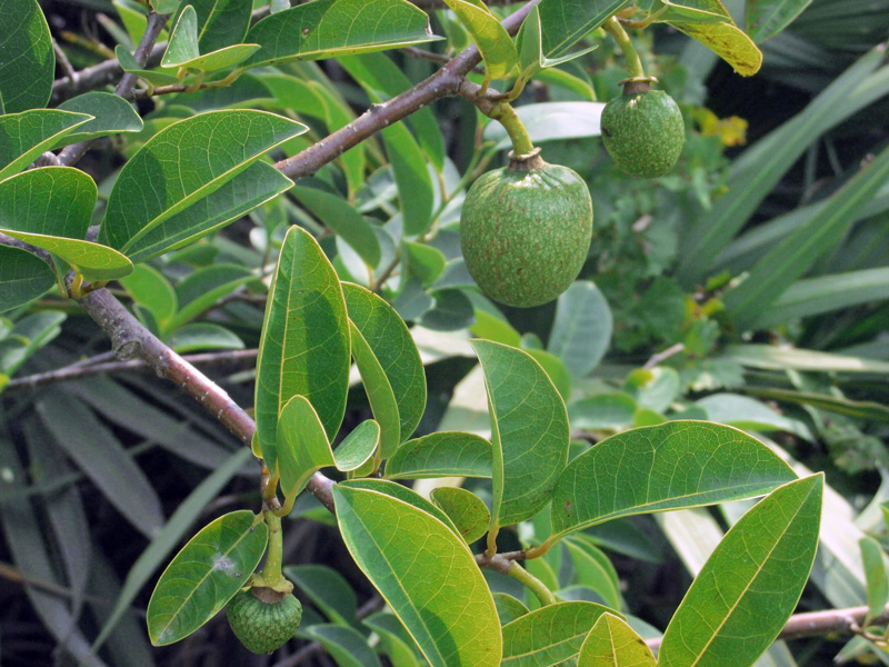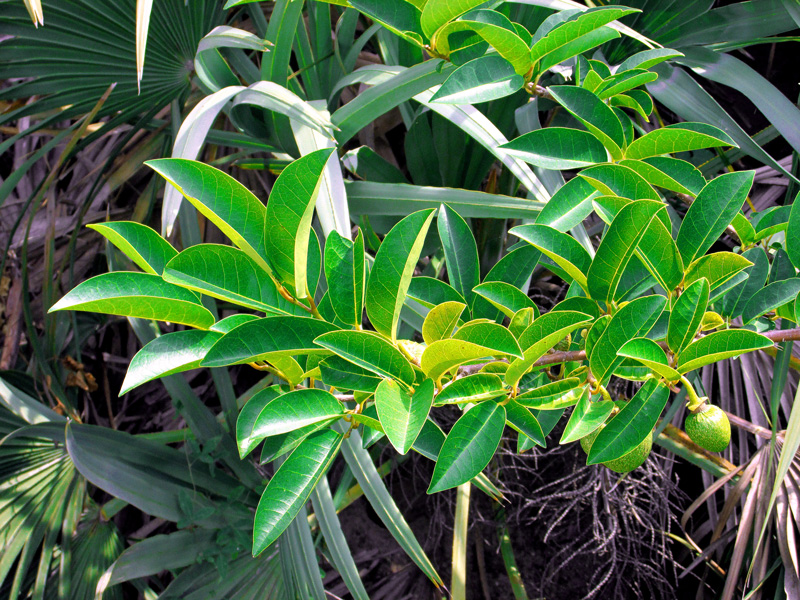Pond apple grows easily and quickly from seed in moist to wet places. It grows near salt water, when protected from direct salt spray, as shown here at Pelican Island National Wildlife Refuge along with giant leather fern (Acrostichum danaeifolium) …