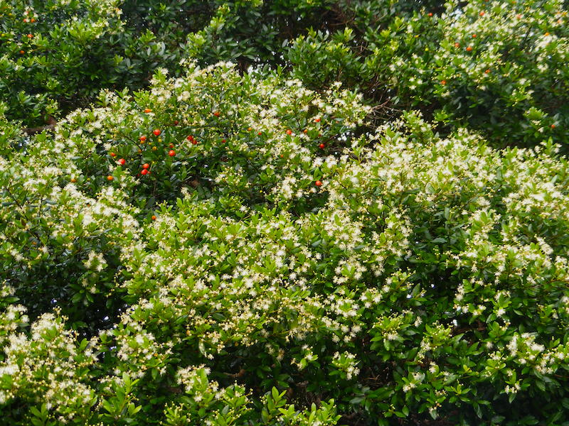 Note the pellucid dots on the leaf at the right side of the photo. When you crush the leaves, these dots that house secretory cavities release a distinctive fragrance.