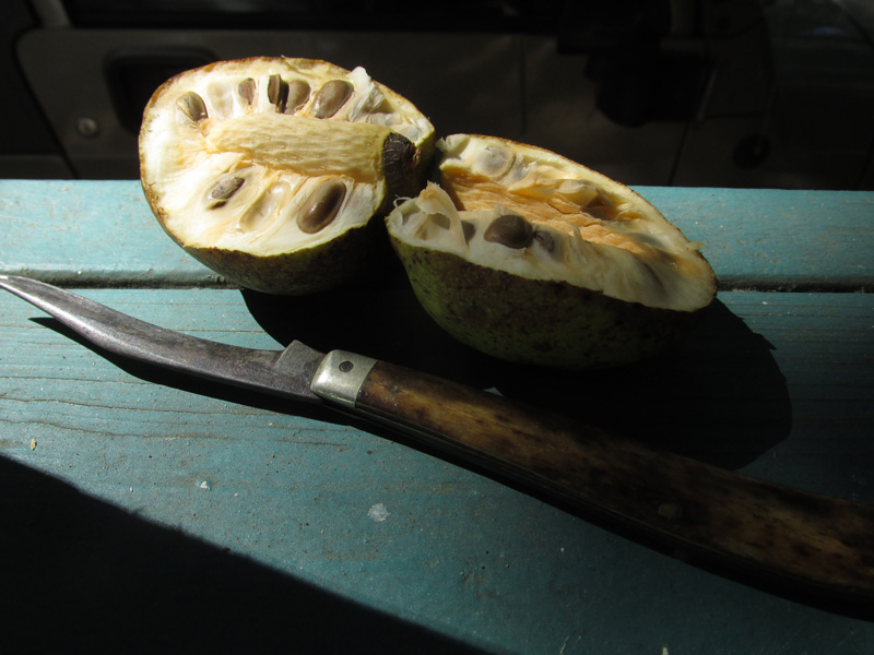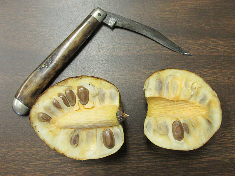 The fruit on the pond apple (Annona glabra) at the entrance to the Florida Medical Entomology Laboratory is now ripe. Special thanks to Bob Montanaro for photo lighting lessons and for the old-fashioned citrus knife with which the fruit was cut open.