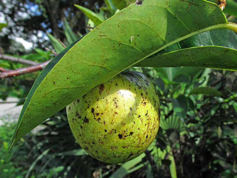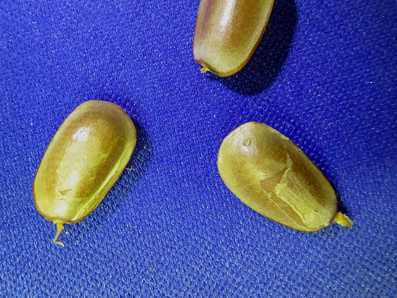 When ripe, the fruit are yellowish, soft to the touch and marked with brown spots. The fruit are not especially yummy to most humans, and I have heard their taste likened to turpentine. Inside each fruit are many, many seeds …