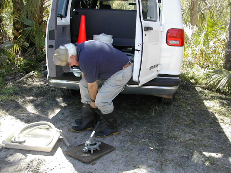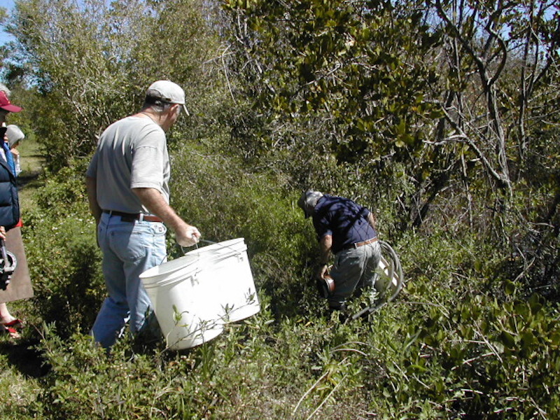 Pictured here in 2005 is Dr. George O’Meara about to siphon out the contents of a great Atlantic land crab (Cardisoma guanhumi) hole as part of the annual Florida Medical Entomology Laboratory – Pelican Island Audubon Society volunteer stewardship class. In order to extract the crabhole mosquito (Deinocerites cancer) larvae and pupae for class inspection, Dr. O’Meara has fashioned his own special pump …
