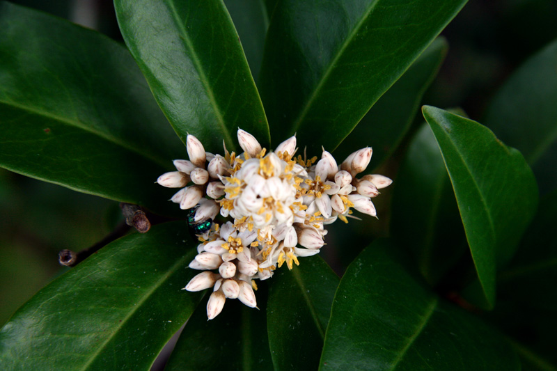 The fall rains have brought a flush of fragrant flowers to many marlberry, showing off the stunning yellow anthers (the pollen-producing part of the plant) referenced by the genus name, Ardisia. The species name, escalloniodies honors Antonio Escallon, a 19th century Columbia botanist.