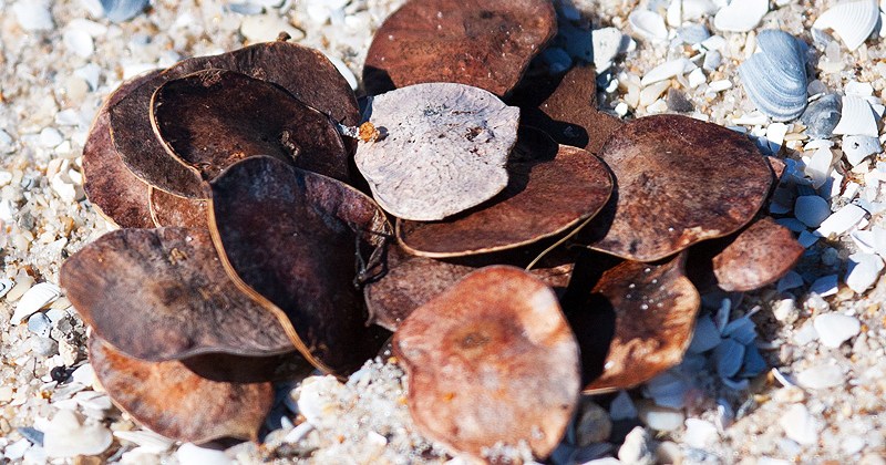 Coin vine seeds are especially prolific on the beach right now. This vining shrub grows on the back of beach dunes and in other coastal places. At the Oslo Riverfront Conservation Area, you can see it growing on the mosquito control dikes …