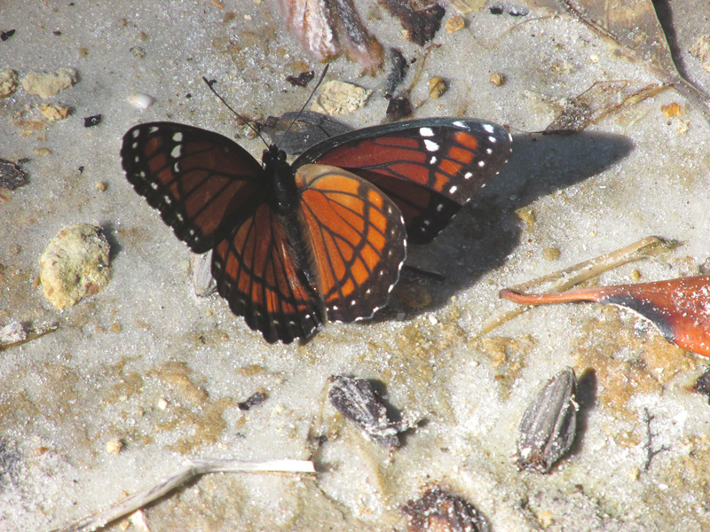 The cooler weather has brought out lots of butterflies out to play. When Bob Montanaro and I took a walk at the Oslo Riverfront Conservation Area to take photographs to use for the upcoming 2015 volunteer stewardship class, we saw zebra longwing, gulf fritillary, mangrove buckeye, monarch and this viceroy (Limenitis archippus). Unlike the neotropical mangrove buckeye, viceroys are found throughout much of the United States. Coastal plain willow (Salix caroliniana) is their larval food at the Oslo Riverfront Conservation Area and can be found growing along Oslo Road, as well as along the portion of the main trail that goes north to south over the DOT culvert.