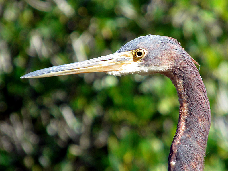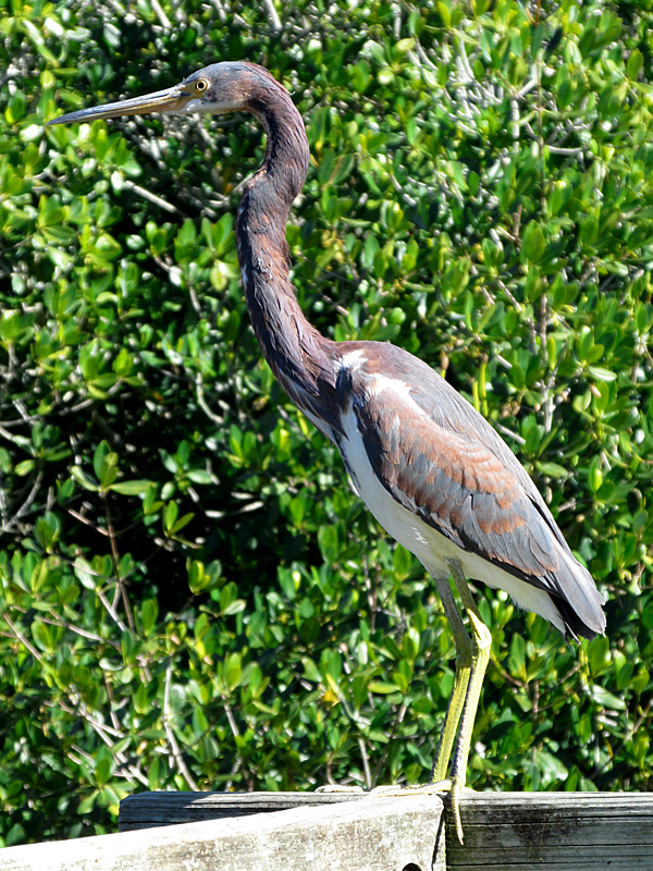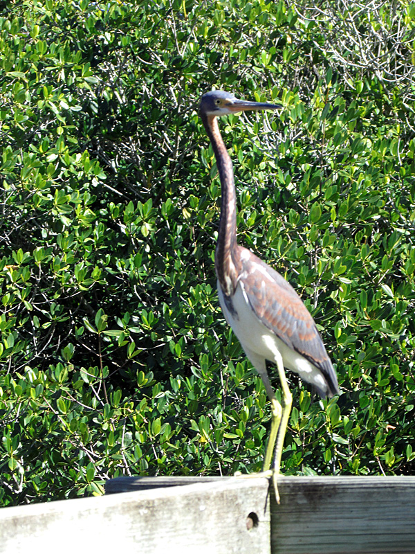 Bob Montanaro and I had just sat down on the viewing platform at the Oslo Riverfront Conservation Area, when a juvenile tricolor heron (Egretta tricolor) landed on the railing. Bob could not get to his camera bag without disturbing our young visitor, so I did my best. Its reddish coloration attests to its youth. Ken Gonyo reported seeing 4 young tricolor herons on his Saturday nature walk a few days later.