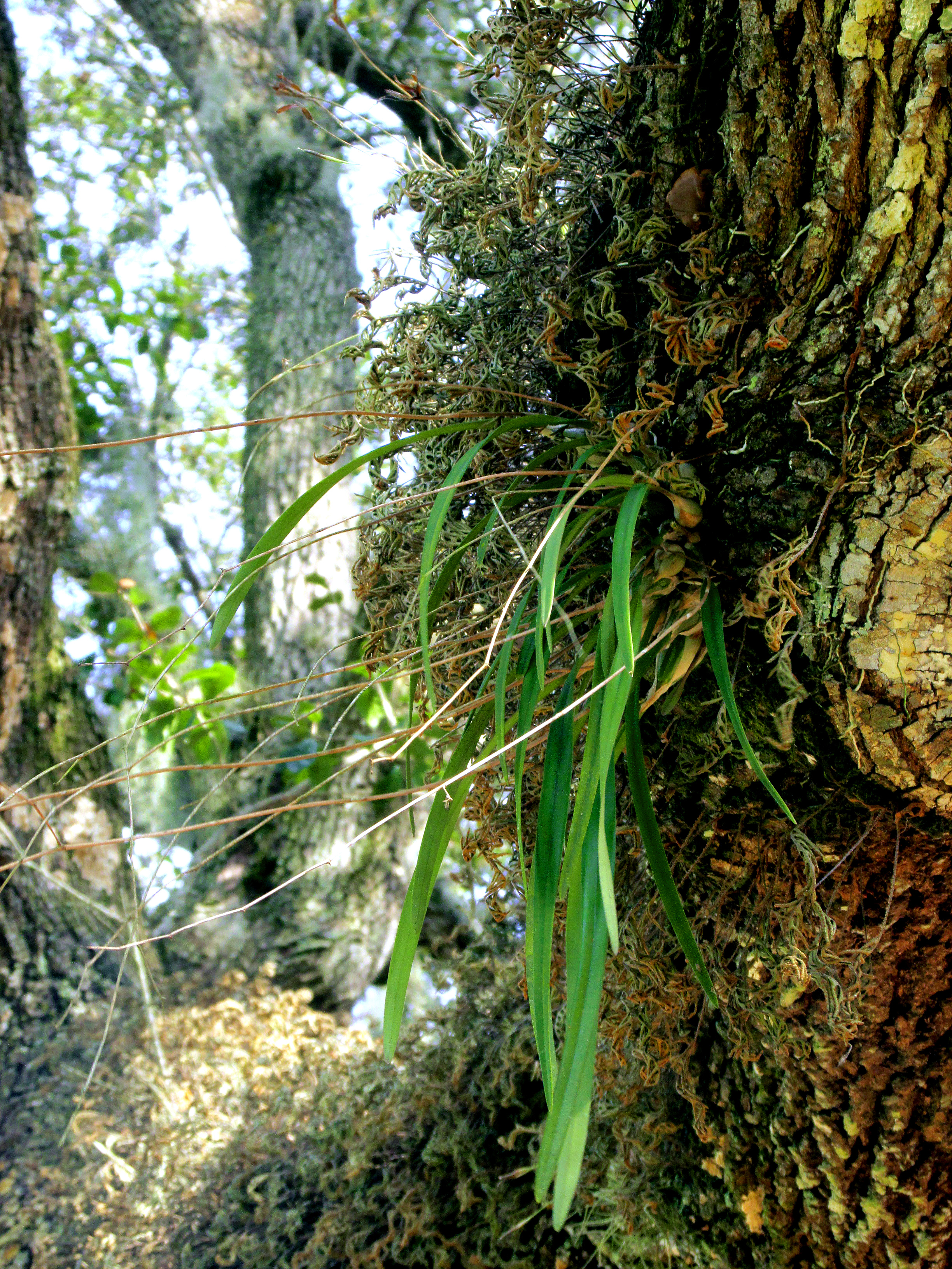This photo was taken at south Oslo Riverfront Conservation Area where the scrubby pine flatwoods transition to moist oak hammock. In addition to butterfly orchid and resurrection fern, other epiphytes — Spanish moss (Tillandsia usenoides), lichens, and, in the upper right, southern needleleaf (Tillandsia setacea) — flourish.