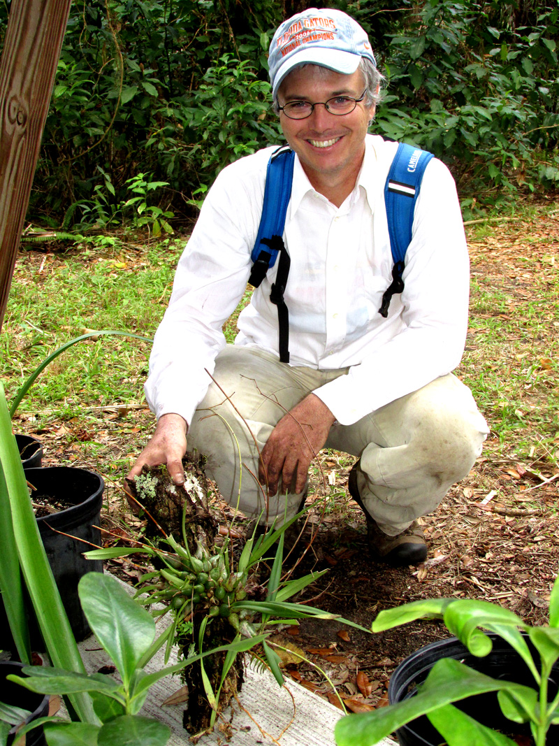 Pictured below is Pelican Island Audubon Society Treasurer Steve Goff (Class of 2006) smiling as he places an orchid-laden branch in ‘storage’ with plants salvaged for re-planting at the Audubon House. The salvaged plants are flourishing due to the extraordinary efforts of Jean ‘JJ’ Romano (Class of 2013) assisted by Susan Warmer, Ken Gonyo, and Dr. Cynthia Lord.