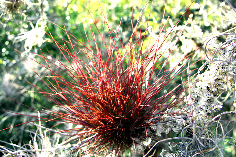 Other common names for this plant include quill-leaf wild pine, needle leaf air plant, and porcupine wild pine. Like ball moss, this epiphyte is found in moist locations throughout Florida and ranges into Georgia. Some epiphytes like red wild pine are tropical and found only in the more tropical parts of Florida.