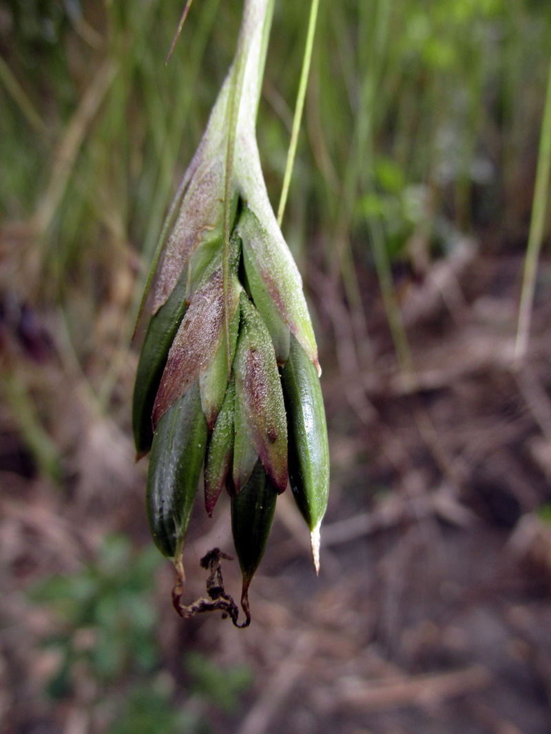 Southern needleleaf blushes as it prepares to flower, as shown above, but spends most of the year being green. Its flowers are much more visible than the minuscule flowers of Spanish moss and ball moss.