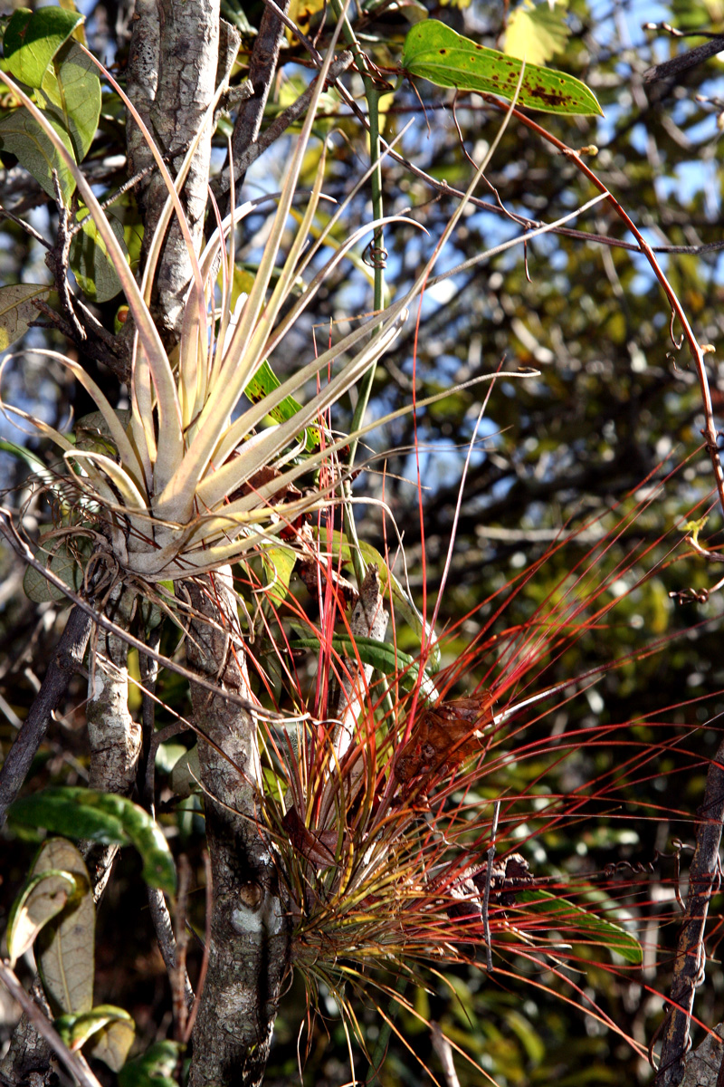 Southern needleleaf (Tillandsia setacea) is an epiphyte that lacks a “tank” as shown on the red wild pine (Tillandsia fasciculata) in the upper left but has more structure than atmospheric epiphytes like Spanish moss and ball moss. Its knitting needle like leaves sometimes collect leaves liter and other detritus, making it a trashbasket in the trees but not a pond in the sky.