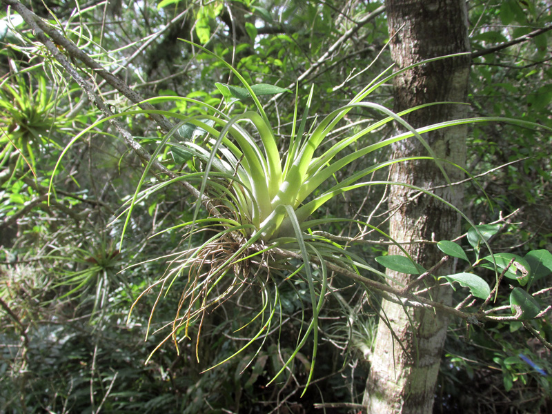 The population of these bromeliads is so much-reduced, but a few individuals have survived to reach reproductive maturity. Gayle Peters (Class of Winter 1999) has conjectured that the “evil weevil” does not tolerate salty coastal conditions well, noting that mature green wild pine now are likely to be found nearer to the Indian River Lagoon, as shown below on the prop and drop roots of a red mangrove (Avicennnia germinans) along with southern needleleaf (Tillandsia setacea) …