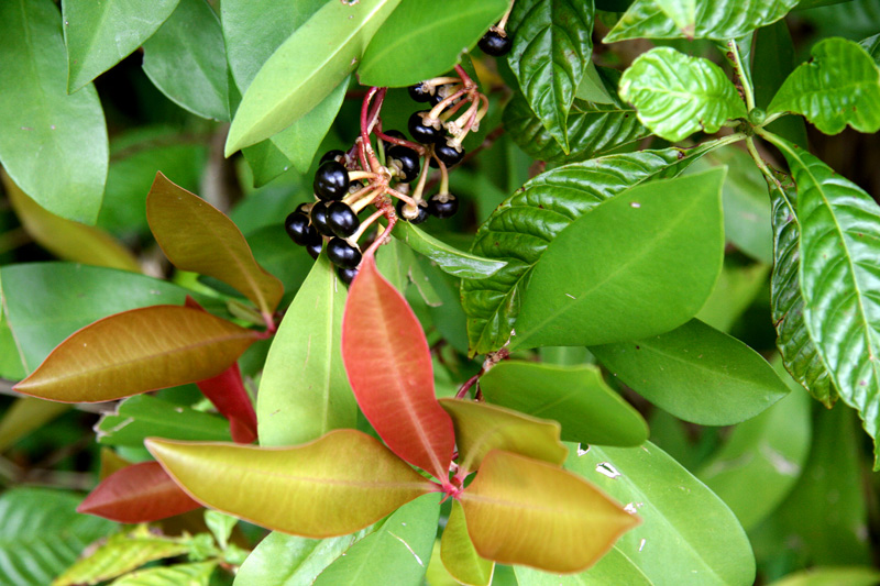 The Wednesday invasive plant control work team — Ken Gonyo, Diane Larue, Jean ‘JJ’ Romano and Susan Warmer — was very displeased to see a tall shoebutton aridisia (Ardisia elliptica) with fruit along Oslo Road as they walked with 2015 volunteer nature stewardship class, despite their ongoing and considerable efforts to control this Florida Exotic Pest Plant Council Category #1 invasive plant. Pictured above, shoebutton ardisia is shown with ripe black fruits and its distinctive new red leaves growing along with shiny-leaved wild coffee (Psychotria nervosa) at the upper right.