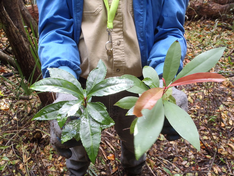 It joins two other plants in this genus at the Oslo Riverfront Conservation Area – the native marlberry (Ardisia escalloniodies) and the other category #1 invasive pest plant shoebutton ardisia (Ardisia elliptica). Also known as coral berry and spice berry, this invasive plant is easily differentiated from shoebutton ardisia by its crenate leaves. Below Ken Gonyo, in another photo taken by Diane LaRue, holds coral ardisia (left) and shoebutton ardisia (right) for comparison …