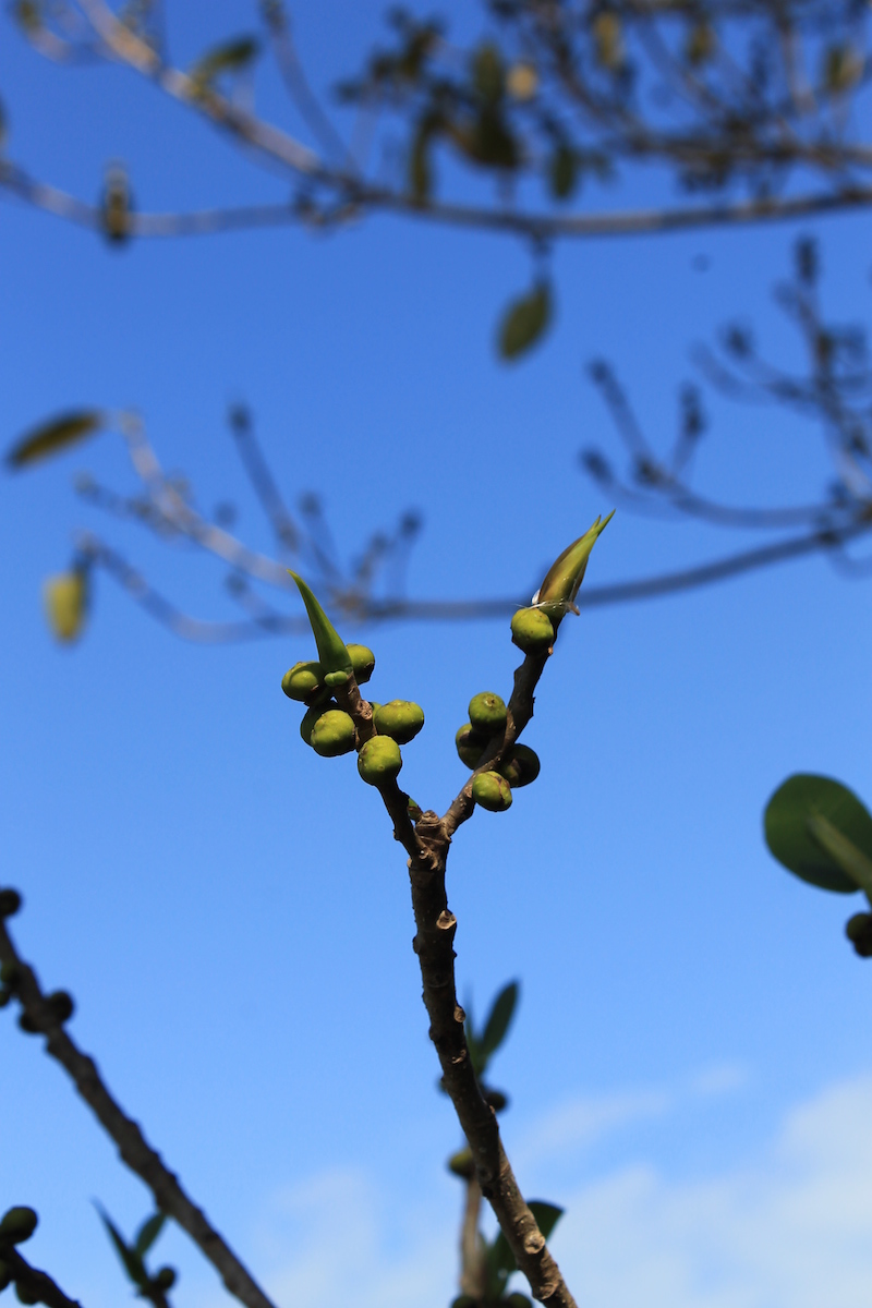 … a strangler fig tree (Ficus aureum) with fresh leaves and not-yet-ripe fruits …