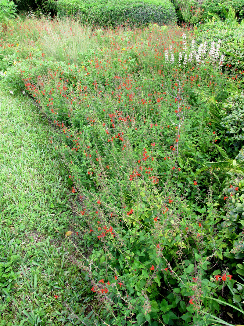 This carpenter bee and other pollinators are attracted to the red red flowers of scarlet sage. Also known as tropical sage or blood sage, this plant flowers throughout the year including through the high heat of summer. Flowering is most profuse in full sun, but this hardy plant will tolerate partial shade. It has been planted in the Audubon House landscape and is shown below in the yard of Martha Willoughby (Class of 1998).