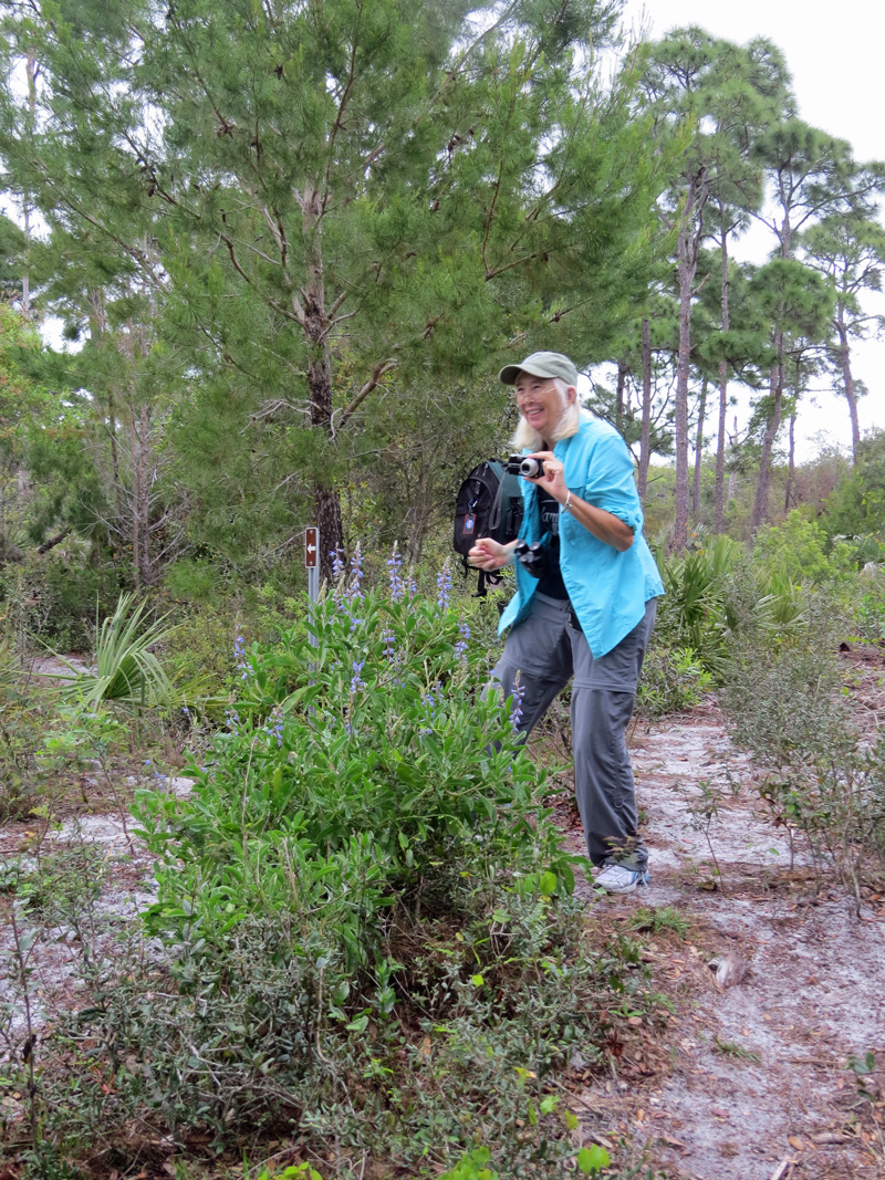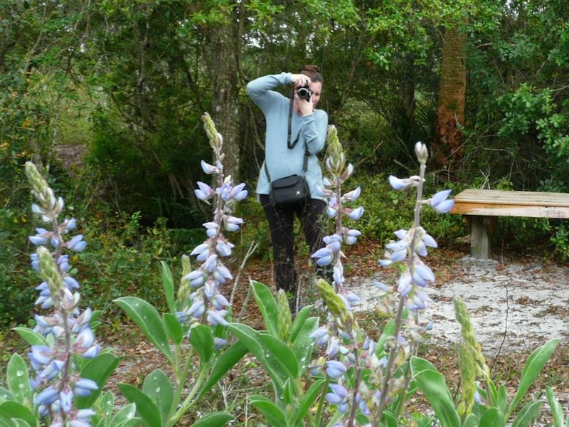 Nancy Soucy (Class of 2010) is shown above photographing sky-blue lupine (Lupinus diffusus) at the south Oslo Riverfront Conservation Area on the group walk that followed her Florida Scrub-Jay banding talk on 3/7/2015.