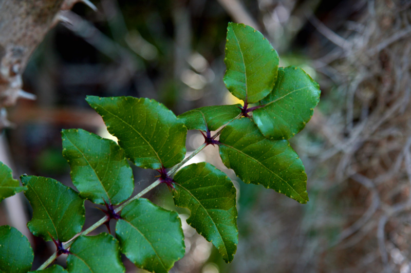 Also known as toothache tree due to the numbing effects of gently chewed (& not swallowed) leaves, Hercules club leaves contain aromatic (lemony) oils. Note the pellucid dots shown here …