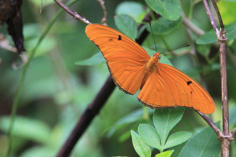 Like of state butterfly, the zebra longwing (Heliconius charitonius tuckeri), julia butterflies are members of the Nymphalidae (brush-footed) family, have long, wide wings, and use corky-stemmed passionflower (Passiflora suberosa) as their larval food. Julia butterflies are far less common than zebra longwings, and like the related gulf fritillary (Agraulis vanilla nigrior), favor sunnier places than zebra longwings. With each year of warm weather, julia butterflies seem to have become more abundant.
