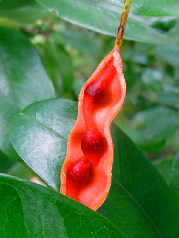 The brown, dangling pods split open length-wise to expose a showy red-orange pulp that encases its soft seeds. Such soft seeds must be planted quickly and are a hallmark of some other tropical plants including simpsons stopper (Myrcianthes simpsonii),