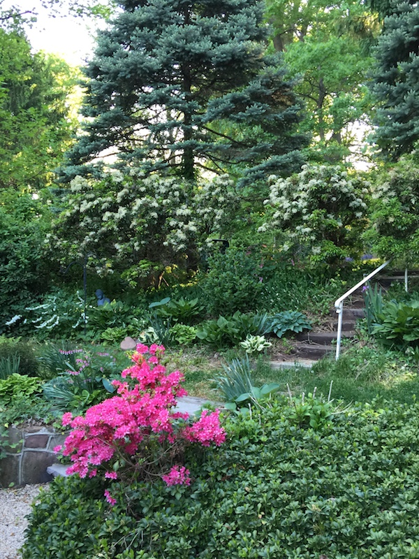 What an artful way to ‘train’ Virginia creeper and avoid its unintended consequences on wooden or painted surfaces. Their floral artistry is evident not only in their yard but in their business, Christoffers Flowers.