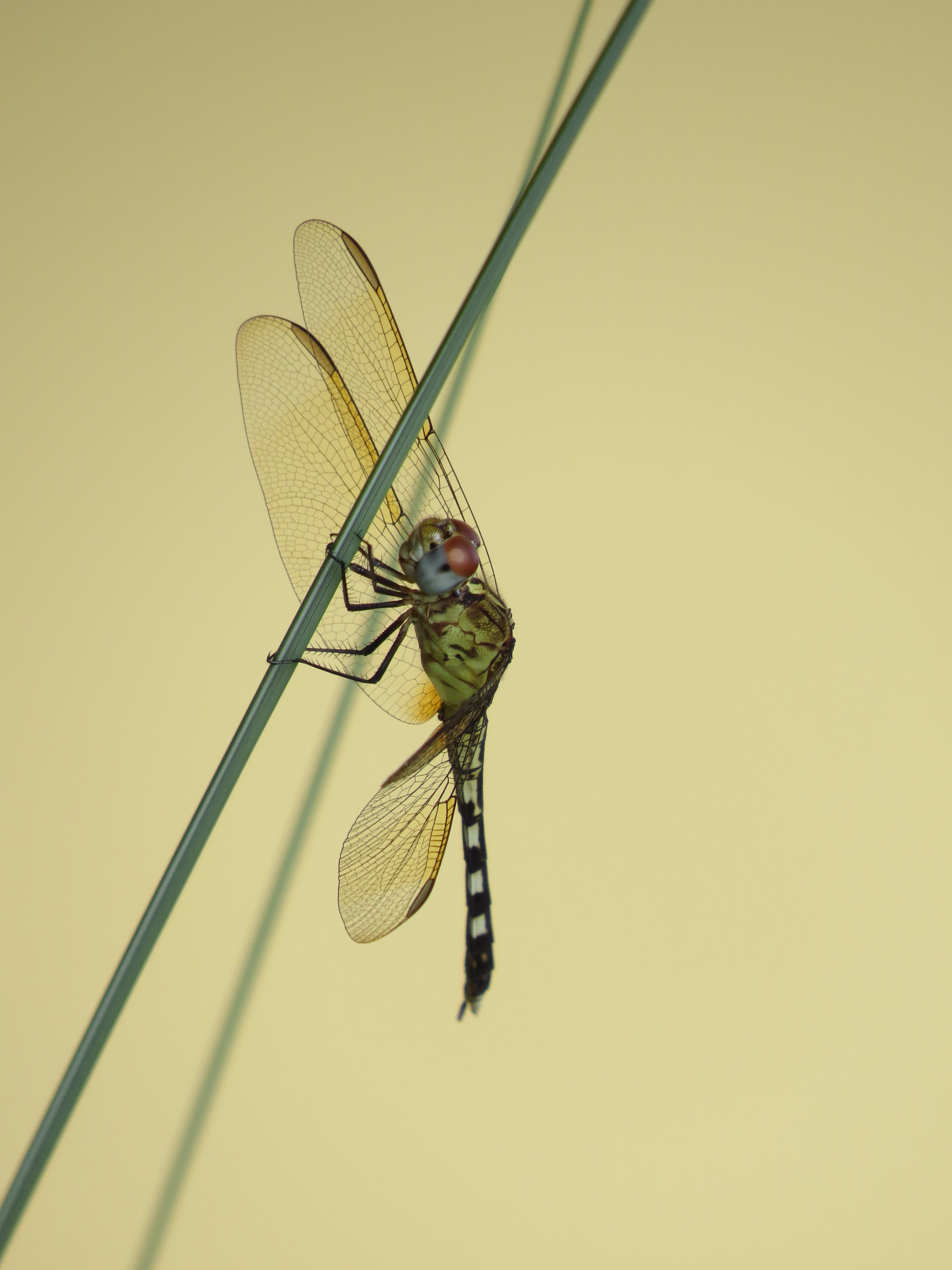This Guide splits dragonflies into 2 groups: fliers or perchers. Fliers capture their prey in flight. Perchers like the band-winged dragonlet perch, usually in a horizontal or diagonal position, and await their prey.