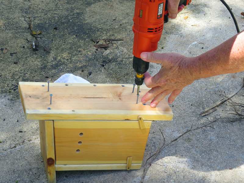 While he used a modern tool & hardware for installation, J.R. used only his vintage tools to create the bluebird house and wren house that he donated and installed at Audubon House.