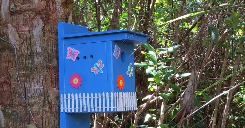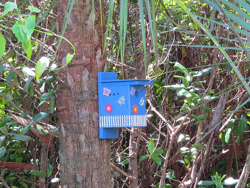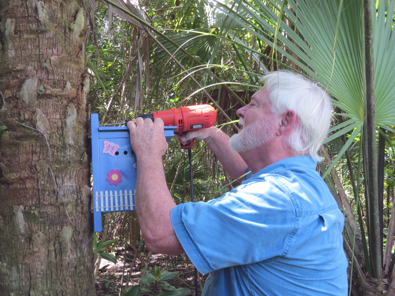 He installed the beautifully decorated (blue) wren house at the entrance to the Audubon House trail in the midst of verdant vegetation.