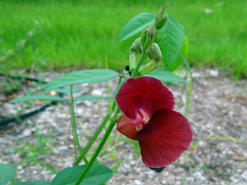 Its flower are large (1″ wide) as the genus name Macroptilium indicates (macro = large, ptilon = feather). Lathryus, from which its species name lathryoides, is derived means pea in Greek.