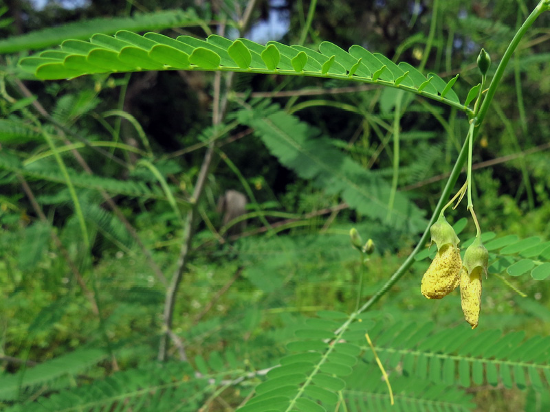 Also known as hemp sesbania, bigpod sesbania, coffee-weed, tall-river hemp and bequila, this member of the pea family, Fabaceae, has compound leaves with 20 to 70 leaflets. Its yellow dangling flowers are speckled with purple and give way to long thin pods which contain a copious number of very viable seeds.