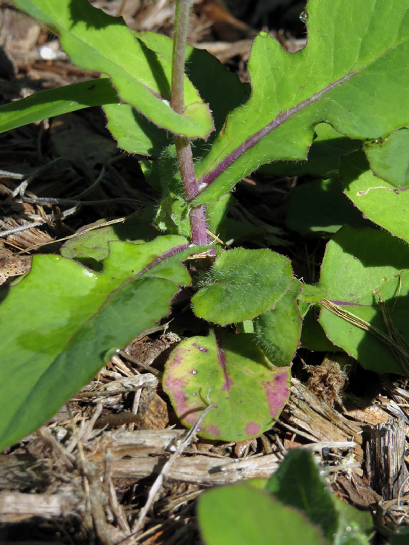 The leaves of lilac tassleflower lack a petiole (leafstem) and clasp the stem. Note the hairiness and reddish coloration of its stem and the leaves.