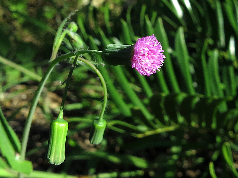 Lilac tassleflower differs in flower color from the more common Florida tassleflower (Emilia fosbergii). Florida tassleflower, also known as flora’s tassleflower, has red urn-shaped flowers and is shown below.