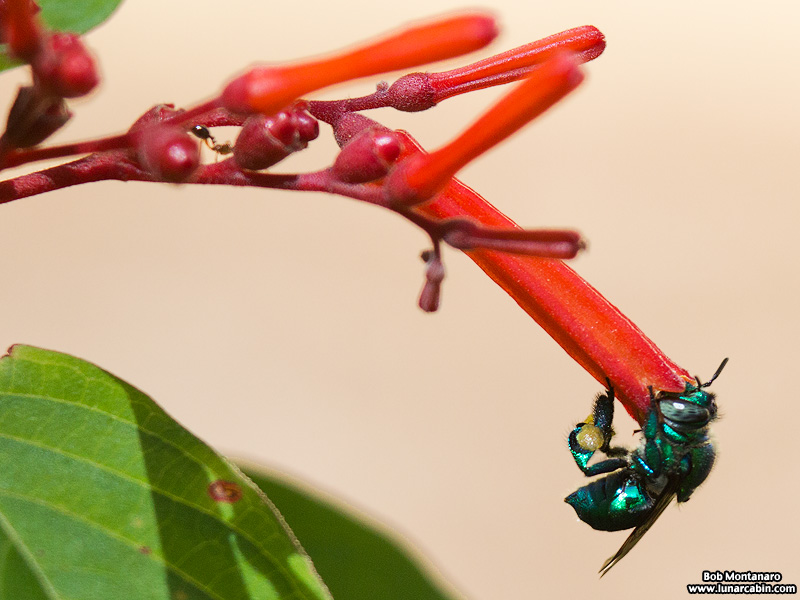 Bob Montanaro took this marvelous macro photograph of a green orchid bee (Euglossa dilemma) at the (Pelican Island) Audubon House on firebush (Hammelia patens). Thank you to Carol Thomas, especially Dr. Eric Blosser, and Dr. Roxanne Rutledge, all from the Florida Medical Entomology Laboratory, for identification help.