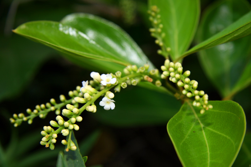 Racemes of fragrant white flowers already adorn the fiddlewood that Dan planted on 10-14-15. Racemes are spikes of flowers that ripen from the stem to the tip. Bees, butterflies & other pollinators visit these small flowers. Flowering occurs throughout most of the year, especially during the summer. Flowering & fruiting often is simultaneous.