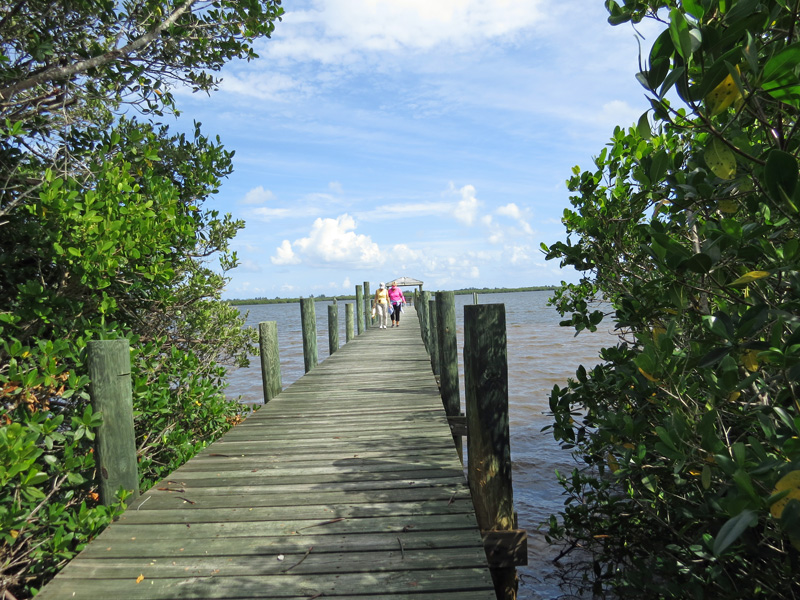 A long dock provides a scenic view of the Indian River Lagoon show here with JJ Romano & Susan Warmer in the distance.