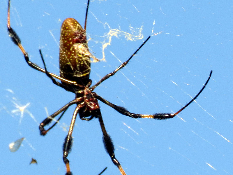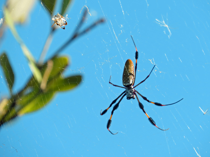 The golden silk spider produces a special silk with which to “wrap up” its prey for future consumption, as you can see in the upper portion of the photo below.