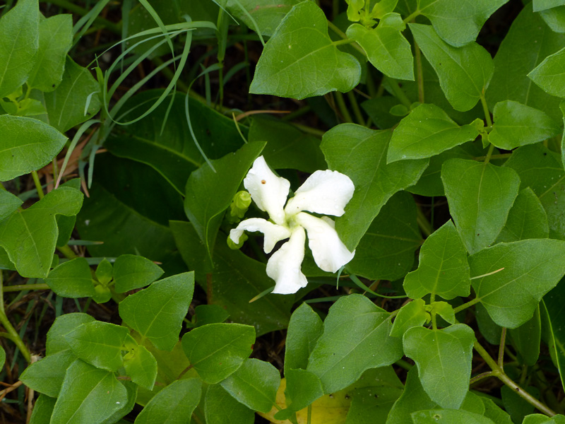 Devil’s potato (Echites umbellatus), a.k.a rubbervine, is an uncommon plant of the coastal strand in Indian River River County and is shown above at Treasure Shores Park on a 6/3/2017 field trip surrounded by the leaves of beach dune sunflower (Helianthus debilis). Coastal strand is the community of flowering plants that grow just above the high tide line at the beach. These plants tend to be succulent and very sturdy.