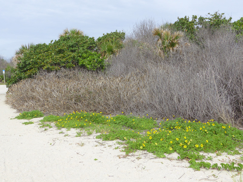 The short path to the (unguarded) beach is now lined with beach dune sunflower, and the dastardly beach naupaka (Scaevola taccada) is dead, having been treated with herbicide by a professional invasive plant control team thanks to Beth Powell, the Indian River County Conservation Lands Manager. The Brazilian pepper (Schinus terebinthifolius) is suffering a similar fate. Both of these plants have been designated to be category #1 invasive pest plants by the Florida Exotic Pest Plant Council (FLEPPC), since they disrupt and devastate native plant communities.
