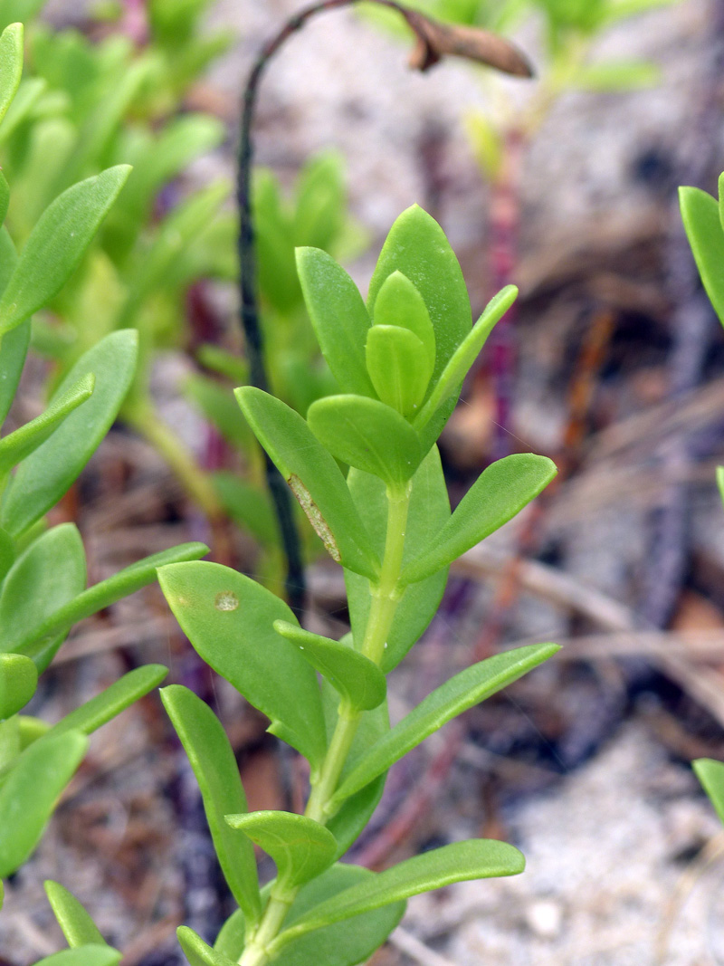 Shoreline purslane (Sesuvium portulacastrum), yet another thick-stemmed succulent, often grows in front of the dune and is found on the mosquito control dikes at the Oslo Riverfront Conservation Area. Both beach elder and shoreline purslane readily root at the nodes, an adaptation that allows them to help to stabilize the shifting sands of the beach dunes and to colonize elsewhere when small stems are transported by the sea or the waters of the Indian River Lagoon.