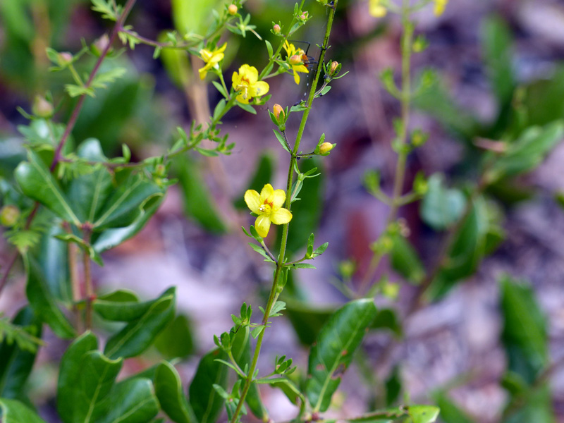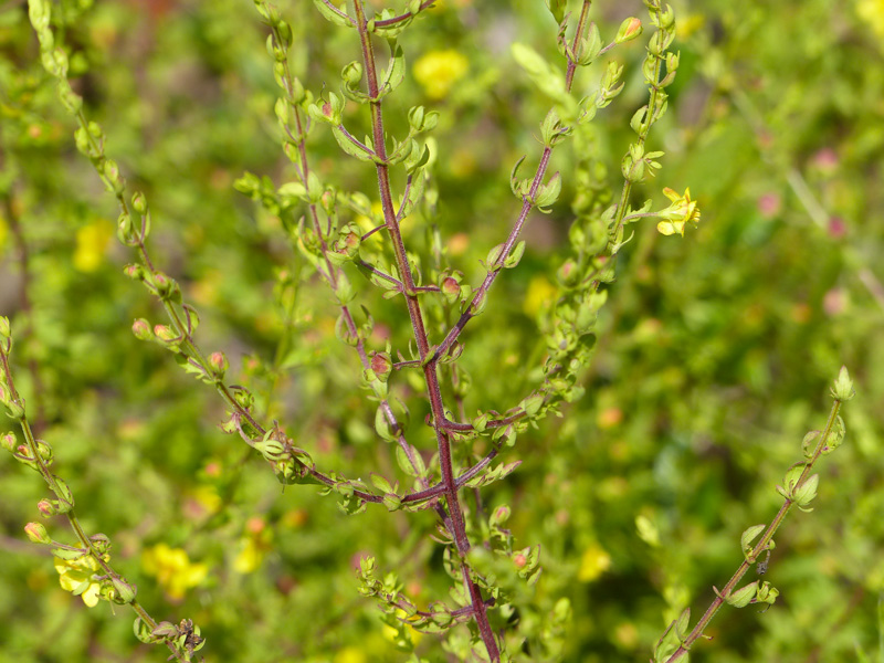 Its small, yellow zygomorphic flowers have 5 petals, and the corolla (center) is tinged with red. The flowers and stems are quite hairy. Flowering begins at the bottom of the plant and continues up the stem.