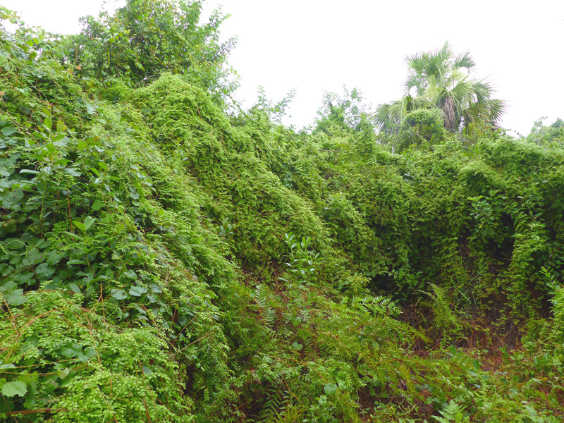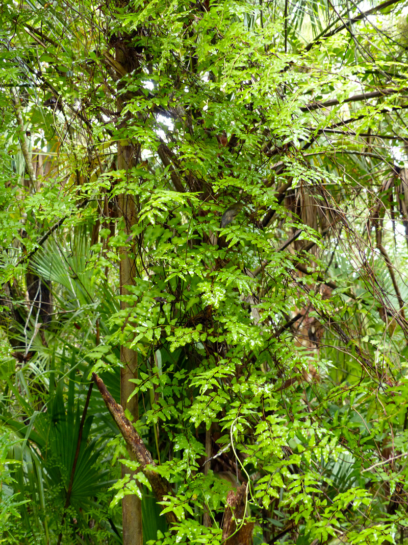 Old world climbing fern (Lygodium microphyllum) makes air potato (Dioscorea bulbifera) look docile. Beware if you see a fern climbing in your yard, shown above along with air potato and cattley guava (Psidium littorale), yet another invasive pest plant. Like all ferns, old world climbing fern reproduces via spores. However, one frond (or “vine”) can be up to 90′ long.