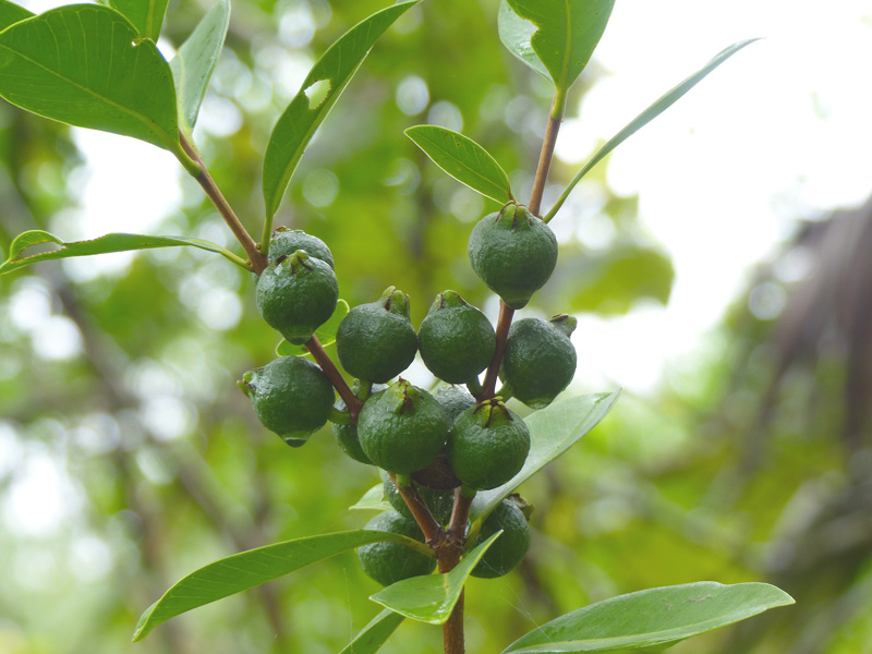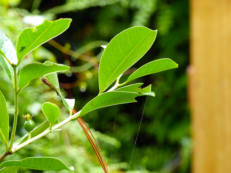 Strawberry guava has opposite leaves that are slick (glabrous), entire, elliptic to oblong, and held on a short petiole (leafstem).