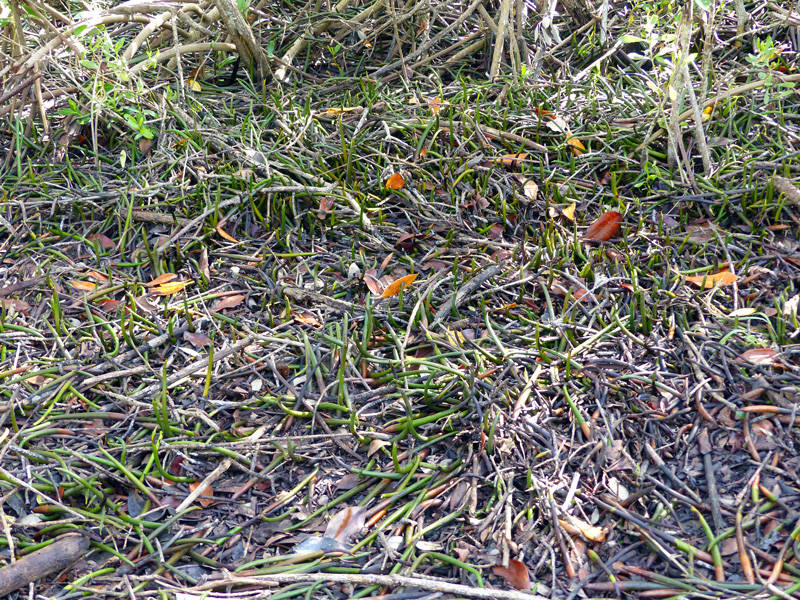 Red mangrove propagules resemble cigars. An amazing amount of red mangroves propagules were piled up, and some were managing to root …
