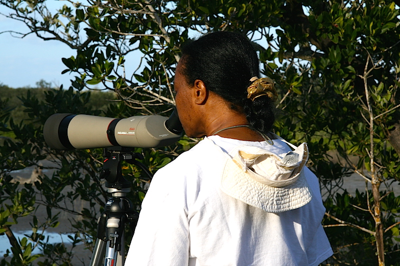 Pearl McKenzie (Class of Fall 1998) above and Susan Boyd (Class of 2003) below look through a spotting scope at Bird’s Impoundment at Pelican Island National Wildlife Refuge (PINWR) on Friday, 3-21-2008, after work walk.