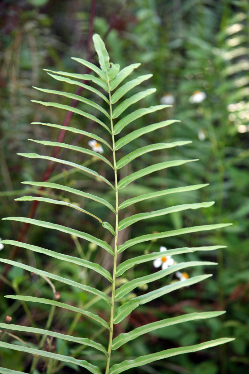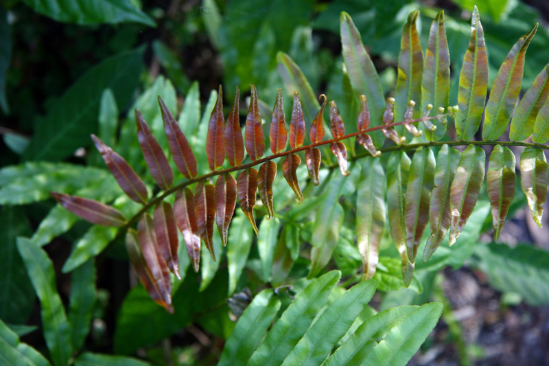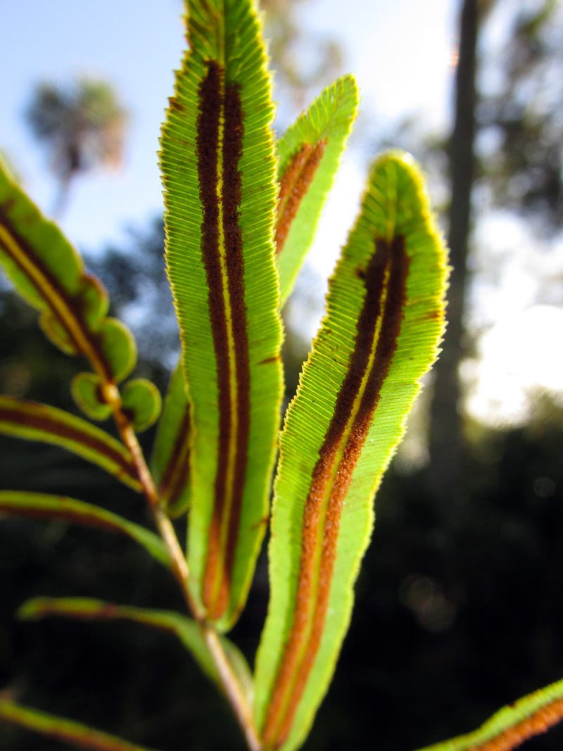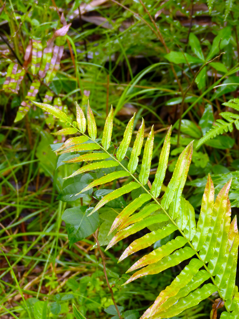 Bob Stolze, former Curator of Ferns at the Illinois Natural History Museum, wrote up descriptions of all of the ferns that he saw at ORCA. For swamp fern, he wrote: “Spore cases (sporangia) are borne in continuous parallel lines on either side of the midrib of fertile leaflets (pinnae).