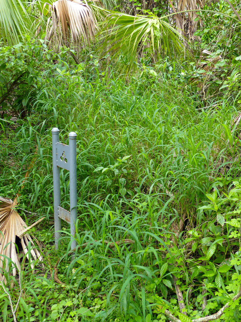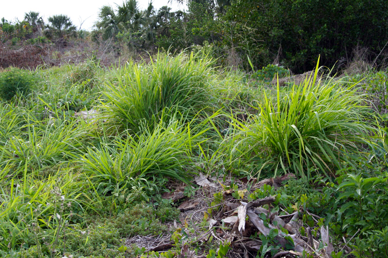 The ORCA link “connector” property on the south side of Oslo Road is an abandoned citrus grove, so guinegrass is especially prevalent there and readily invades any new trails. Below is a photo taken in 2008 at the ORCA link not long after the Brazilian pepper (Schinus terebinthifolia) and aged citrus trees were mechanically removed and mulched up by the Indian River Mosquito Control District.